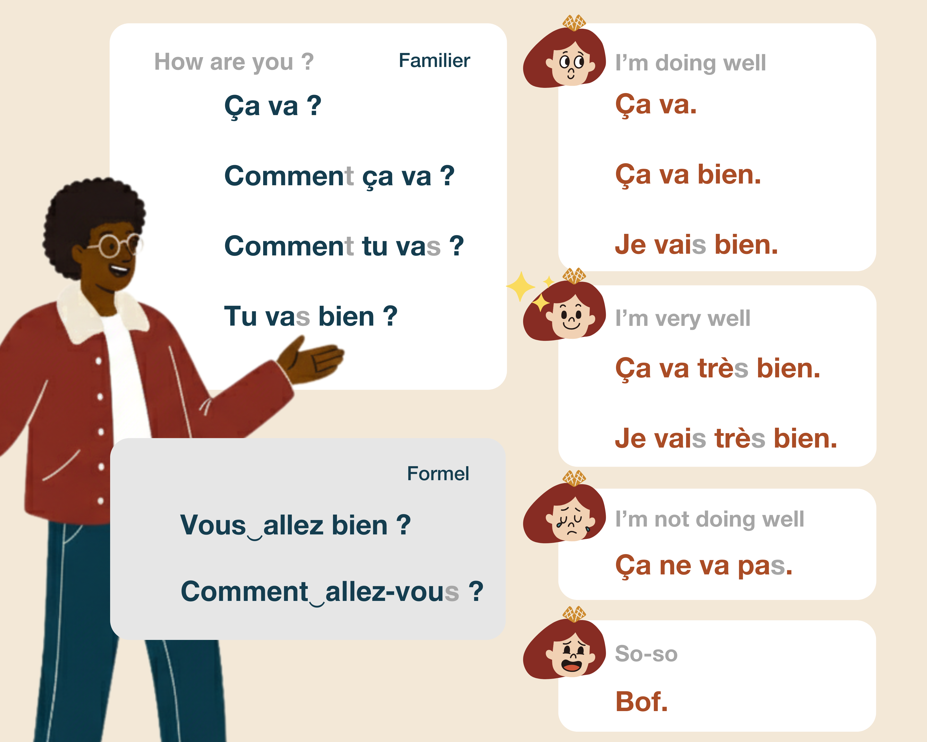 Try this memory game to help you recognize and pronounce the four most common answers to “Comment ça va ?”.